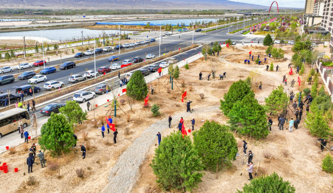 清明时节,讨赖河生态文化景区碧波荡漾,鸥鸟翔集,与远处的雪山构成一幅美丽的生态画卷。