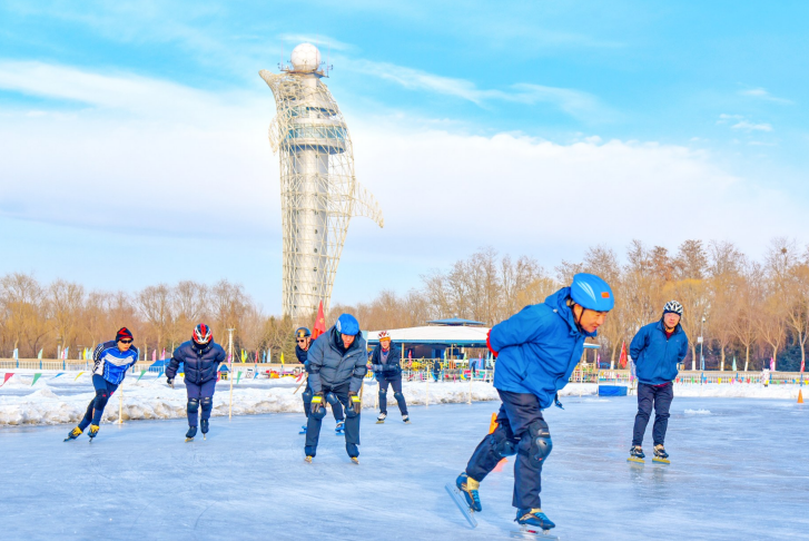 1月6日,速滑爱好者在东湖生态旅游景区冰面上尽情驰骋。