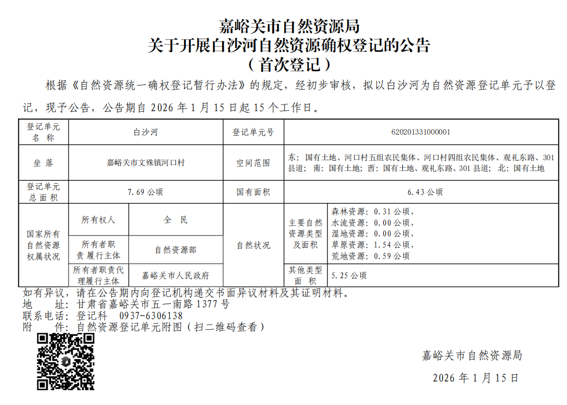 嘉峪关市自然资源局关于开展白沙河自然资源确权登记的公告(首次登记)