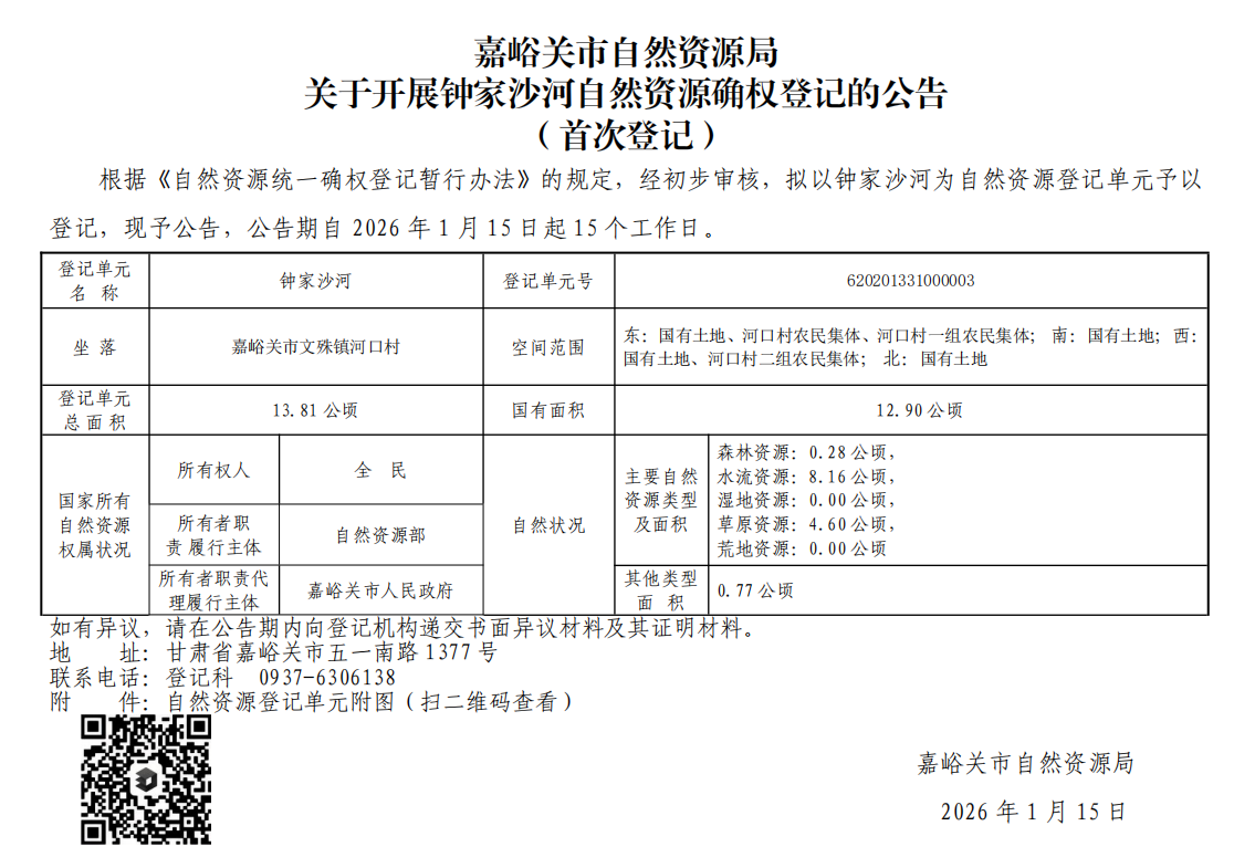嘉峪关市自然资源局关于开展钟家沙河自然资源确权登记的公告(首次登记)