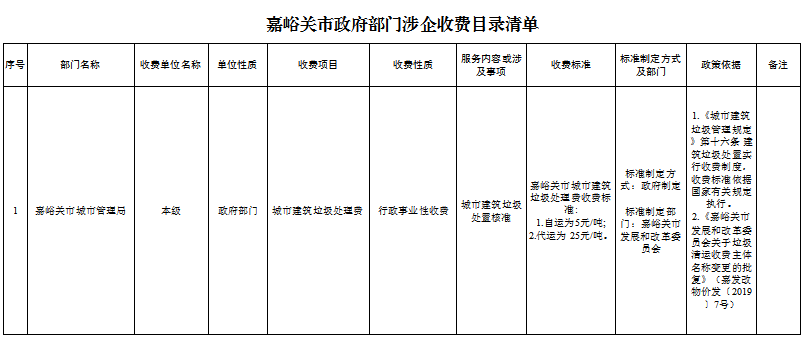 | 1 | 嘉峪关市城市管理局 | 本级 | 政府部门 | 城市建筑垃圾处理费 | 行政事业性收费 | 城市建筑垃圾处置核准 | 嘉峪关市城市建筑垃圾处理费收费标准: 1.自运为5元/吨; 2.代运为 25元/吨。 | 标准制定方式:政府制定 标准制定部门:嘉峪关市发展和改革委员会 | 1.《城市建筑垃圾管理规定》第十六条 建筑垃圾处置实行收费制度,收费标准依据国家有关规定执行。 2.《嘉峪关市发展和改革委员会关于垃圾清运收费主体名称变更的批复》(嘉发改物价发〔2019〕7号) | |