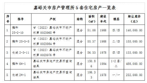 一、拍卖标的:嘉峪关市房产管理所5套住宅。