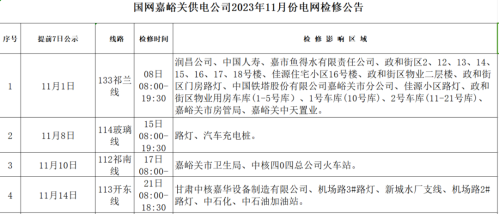 接国网嘉峪关供电公司通知,2023年11月8日(周三)08:00--19:30将对133祁兰线进行电网检修,我中心处于检修影响区域,届时我中心将停电,停办所有对外业务。