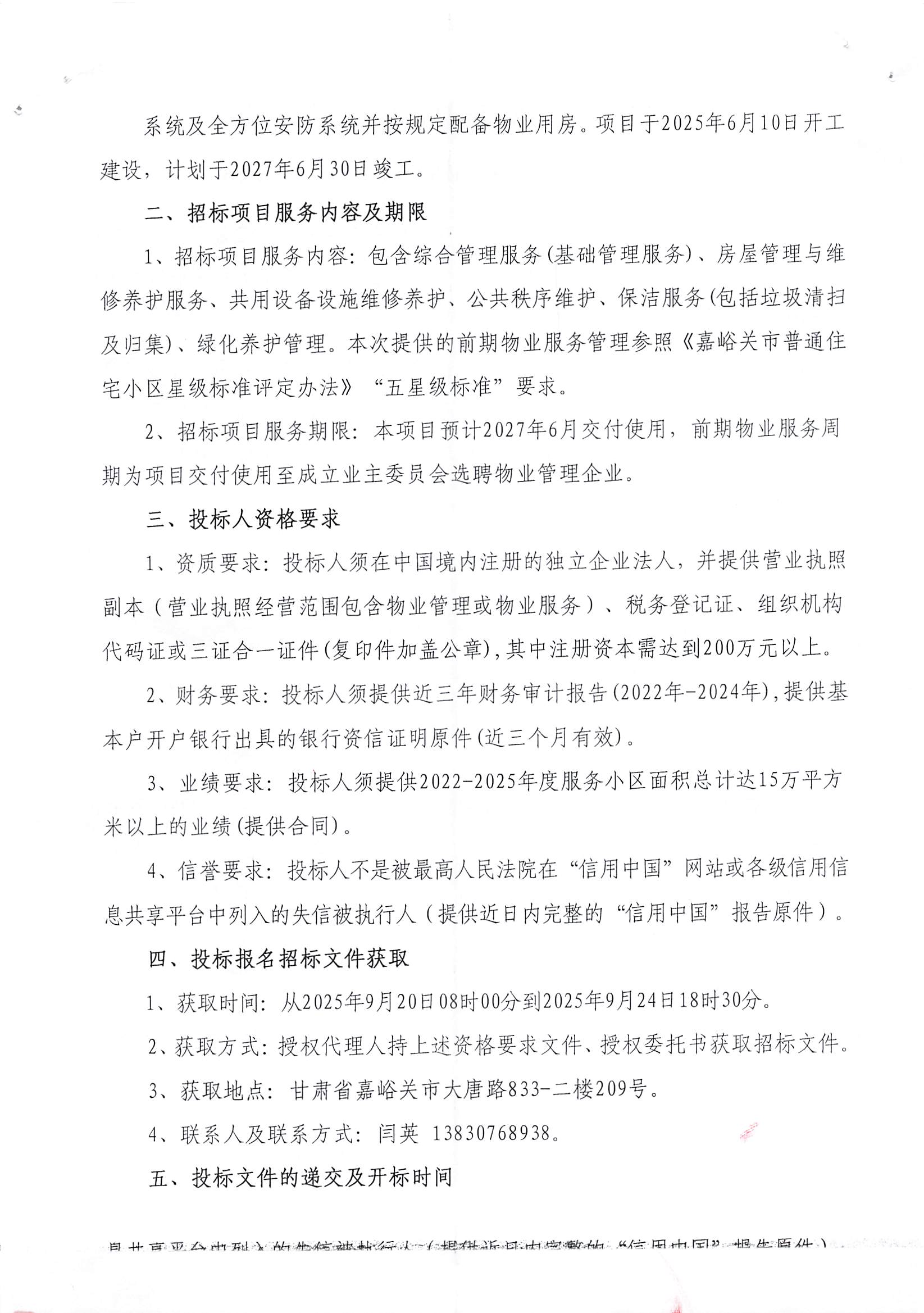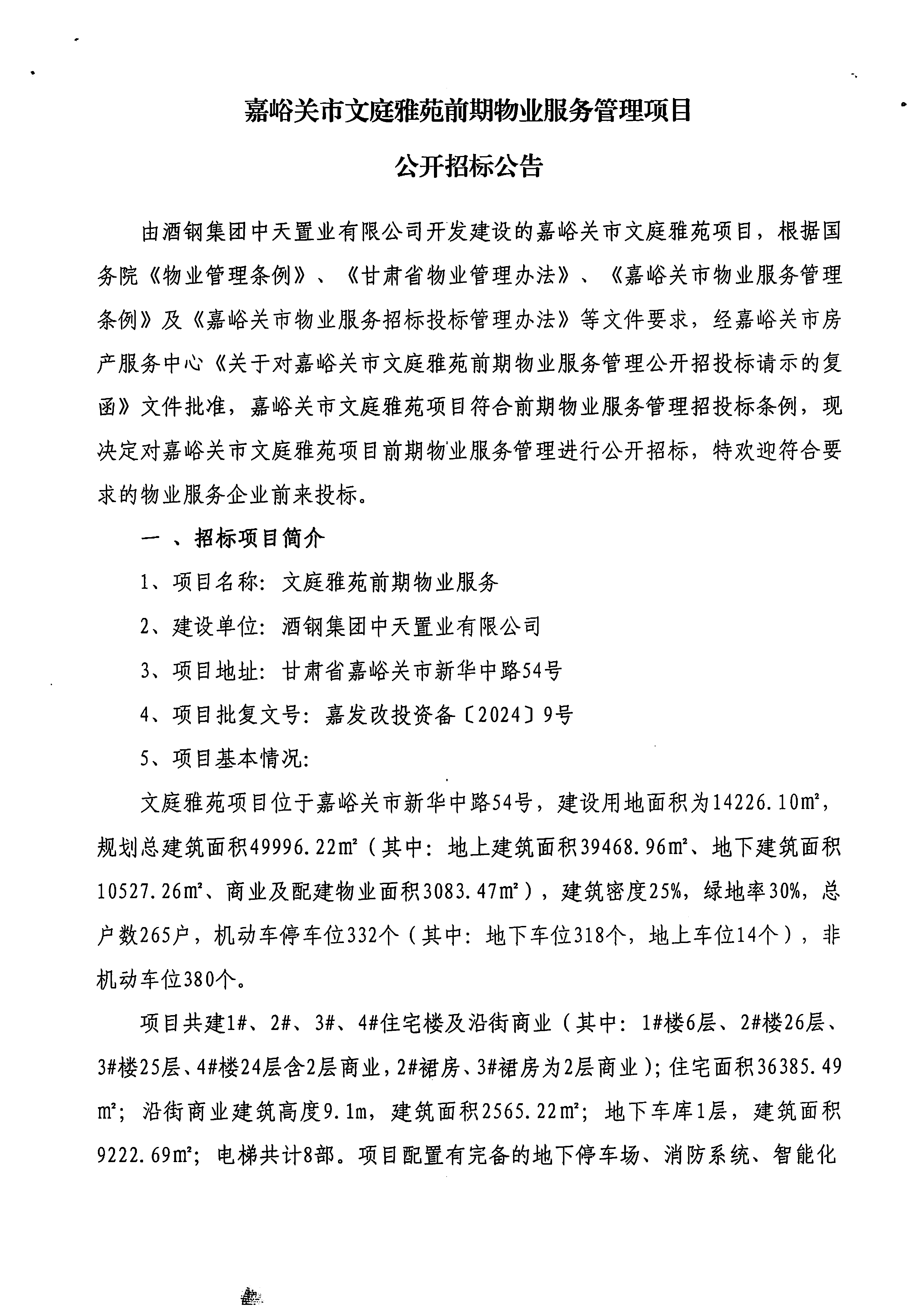 嘉峪关市文庭雅苑前期物业服务管理项目公开招标公告