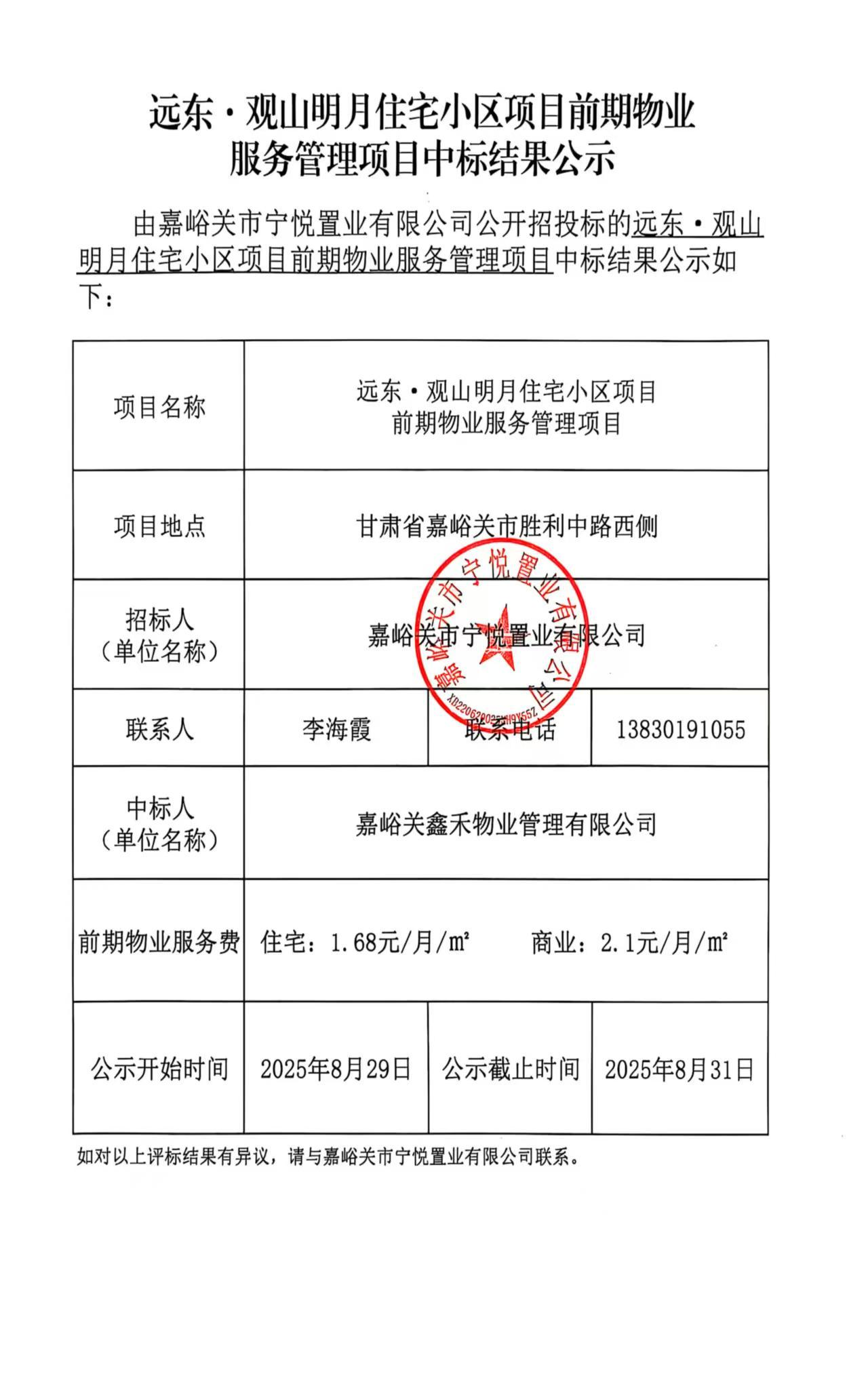 远东·观山明月住宅小区项目前期物业服务管理项目中标结果公示