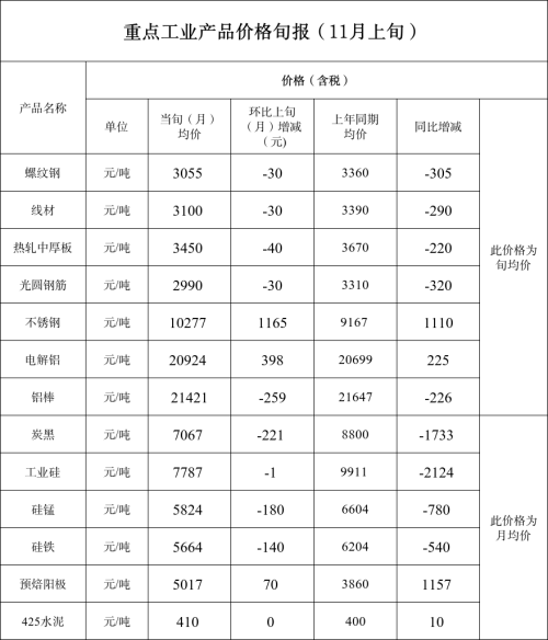 重点工业产品价格旬报(11月上旬)