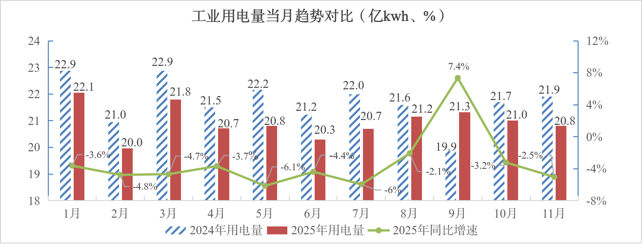 重点监测产品价格环比小幅上涨。11月份,重点监测的10种产品价格同比“5升5降”。黑色金属行业产品价格呈现分化走势,螺纹钢3055元/吨,同比下降7.8%;热轧中厚板3437元/吨,同比下降5.4%;不锈钢9223元/吨,同比增长0.7%;硅锰5824元/吨,同比下降6.9%;硅铁5684元/吨,同比下降13.3%;螺纹钢、热轧中厚板等建筑钢材价格同比下降,反映出房地产及基建领域需求仍相对疲弱,对黑色金属市场形成拖累。有色行业产品价格小幅上涨,电解铝21029元/吨,同比增长1.5%;铝棒21705元/吨,同比增长1.7%;主要受益于供应端受限、成本支撑及新能源等领域需求稳健,显示出有色金属行业在当前宏观经济环境下仍具备一定韧性。非金属行业产品价格走势明显分化,预焙阳极5239元/吨,同比增长36.4%,预焙阳极受电解铝行业带动及原料价格上涨影响同比大幅增长;425水泥410元/吨,同比增长2.5%;炭黑6533元/吨,同比减少24%,可能与轮胎等下游行业需求减弱、原料价格回落有关。