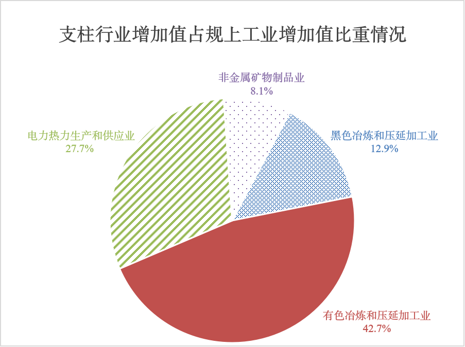 四大重点行业“三增一降”。11月,四大重点行业合计完成总产值99.8亿元,占全市规上工业总产值的92.2%,同比增长12%,是支撑工业经济稳定增长的主要力量。1-11月,四大重点行业完成工业总产值1119.5亿元(占全市规上工业总产值91%),同比增长3.7%,对全市规上工业贡献率达到126%。其中:黑色冶炼和压延加工业完成产值337.7亿元,同比增长1.6%,支撑工业增加值增长约2个百分点;有色冶炼和压延加工业完成产值614.5亿元,同比增长6%,支撑工业增加值增长约3.2个百分点;非金属矿物制品业完成产值63亿元,同比增长43.8%,支撑工业增加值增长约0.6个百分点;电力、热力生产和供应业完成产值104.3亿元,同比下降15.5%,支撑工业增加值增长约2.5个百分点。