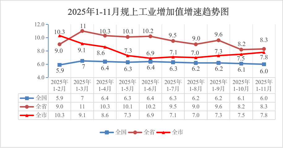 11月份,全市规上工业经济总体延续平稳增长态势,当月,规上企业完成工业总产值108.3亿元,同比增长8.2%,完成增加值12.6亿元,同比增长9.2%。1-11月,规上企业完成工业总产值1233亿元,同比增长2.7%,完成增加值138.9亿元,同比增长7.8%,增速比1-10月提升0.3个百分点,排全省第10位。