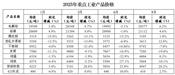 重点监测产品价格回暖。9月份,全市重点监测的10种工业产品价格呈现“七升三降”态势。预焙阳极均价连续9个月保持上升,电解铝、铝棒连续7个月上行,螺纹钢、热轧中厚板、硅铁均价在经历连续10个月下跌后本月止跌回升。其中,螺纹钢(3195元/吨)上涨33元,热轧中厚板(3613元/吨)上涨410元,硅锰(6004元/吨)上涨20元。不锈钢(8743元/吨)下跌655元,炭黑(7288元/吨)下跌1712元,硅铁(5804元/吨)下跌650元价格持续下跌。