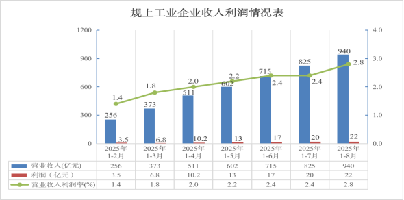 企业营收稳增,利润承压明显。1-8月,全市规上工业企业实现主营业务收入888亿元,同比增长2.9%,整体营收保持平稳增长但盈利端承压明显,实现利润22亿元,同比下降24%。营业收入利润率2.8%,比上半年提升0.4个百分点。