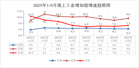 今年以来,面对重点企业集中检修、产能阶段性收缩等多重压力,我们通过“一企一策”强化要素保障,推动在产企业满负荷运行,指导停产检修企业加快检修进度,提前做好检修完成后的产能释放准备工作,工业经济总体保持稳定增长态势。1-9月,规上工业企业完成总产值1014.7亿元,同比增长1.4%,完成工业增加值113亿元,同比增长7.3%,排全省第9位,位次比1-8月提升1位。9月当月,规上工业企业完成总产值106.6亿元,同比增长2.5%,完成增加值12.4亿元,同比增长10.2%。