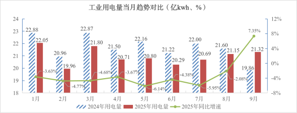 工业用电企稳回升。1-9月,全市工业用电量188.8亿千瓦时,占全省总量的19.9%,同比下降3.2%。但从单月数据看,9月工业用电企稳回升态势显著,当月用电量达21.3亿千瓦时,同比增长7.3%,较8月提升9.5个百分点。全市发电量20.8亿千瓦时,同比增长11.8%;工业用气量为1.01亿立方米,同比增长2.9%,能源消费整体呈现回暖趋势。金融支持方面,截至9月底,全市工业企业贷款余额491.37亿元,同比增长11.15%,其中,中小微企业贷款余额96.97亿元,同比增长22%,反映出信贷资源持续向实体经济特别是中小微企业倾斜。