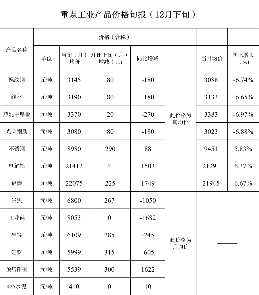 重点工业产品价格旬报(12月下旬)