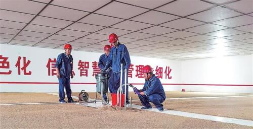 粮库管理人员进行扦插采样,确保储备粮质量。