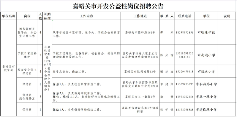 根据工作需要,嘉峪关市教育局面向社会公开招聘公益性岗位人员15名,现将有关事项公告如下: