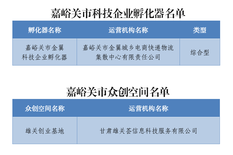关于公布2022年嘉峪关市科技企业孵化器和众创空间名单的通知