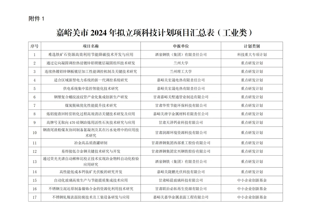 附件:1.嘉峪关市2024年拟立项科技计划项目汇总表(工业类)