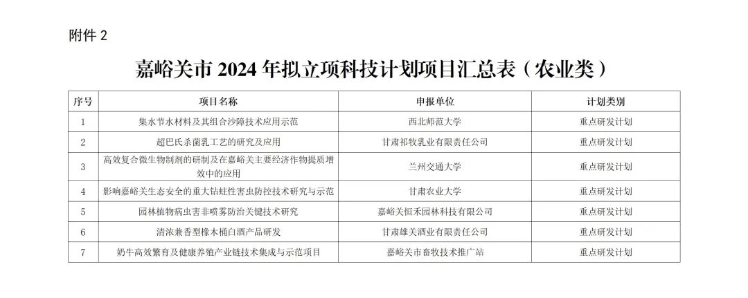 2.嘉峪关市2024年拟立项科技计划项目汇总表(农业类)