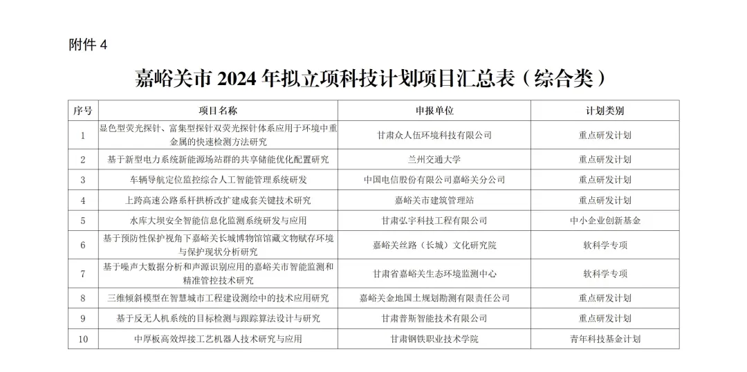 4.嘉峪关市2024年拟立项科技计划项目汇总表(综合类)