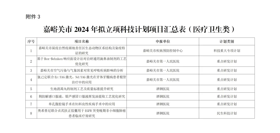 3.嘉峪关市2024年拟立项科技计划项目汇总表(医疗类)
