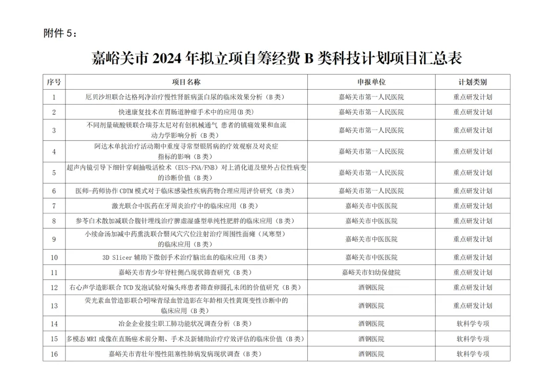 5.嘉峪关市2024年拟立项自筹经费(B类)科技计划项目汇总表