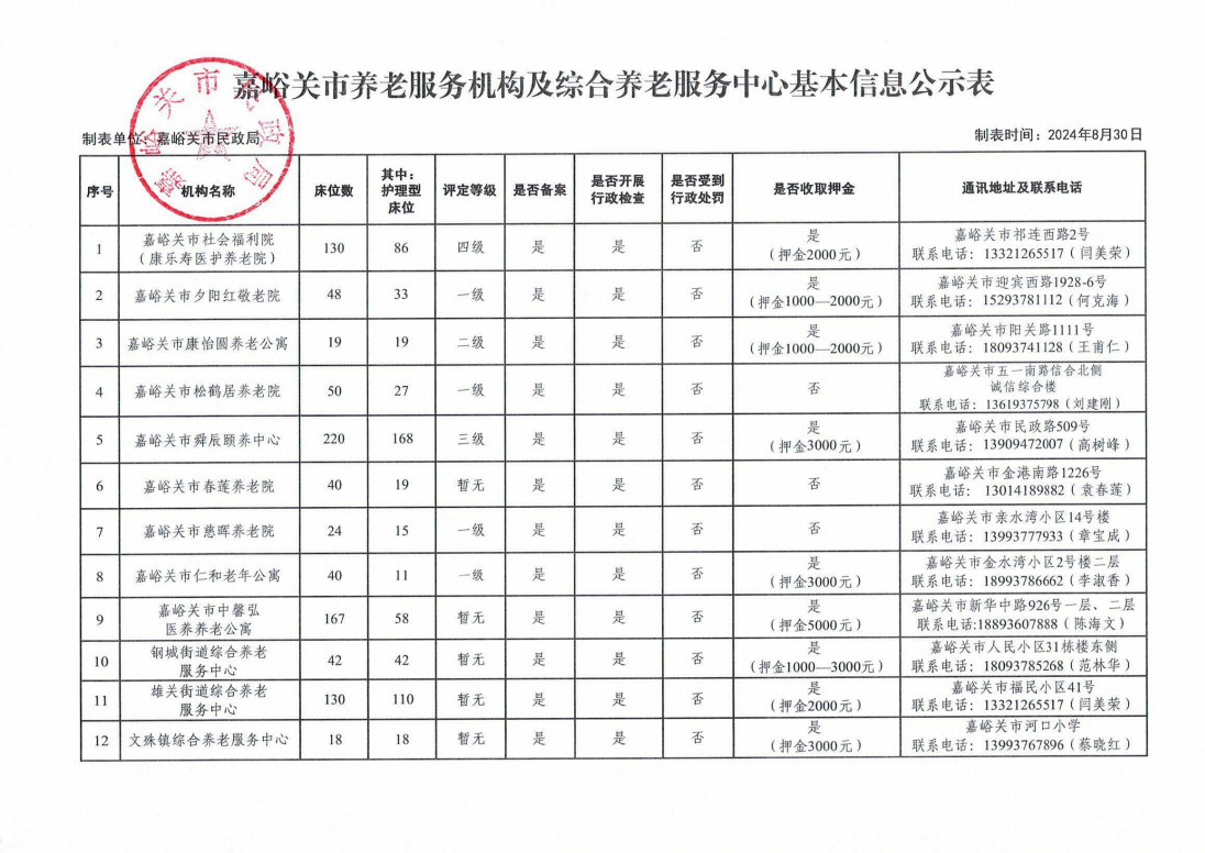 嘉峪关市养老服务机构及综合养老服务中心基本信息公示