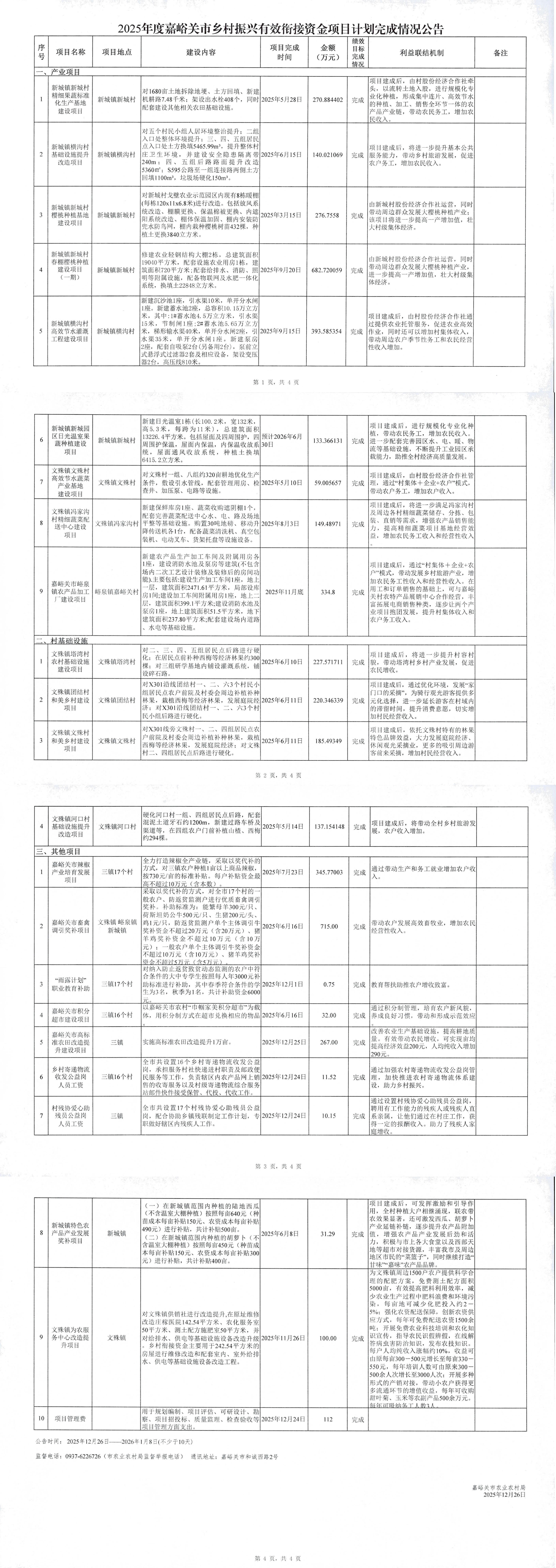 根据《中共嘉峪关市委农村工作领导小组办公室关于下达嘉峪关市2025年第一批财政衔接推进乡村振兴补助资金项目计划的通知》(嘉农领办发〔2024〕28号)和《中共嘉峪关市委农村工作领导小组办公室关于下达嘉峪关市2025年第二批财政衔接推进乡村振兴补助资金项目计划的通知》(嘉农领办发〔2025〕16号)精神,2025年下达中央、省、市级财政衔接推进乡村振兴补助资金4836.67万元(其中:中央资金1214万元,省级资金3334万元),共实施项目23个,其中:乡村产业发展类项目13个,乡村建设类项目5个,乡村治理类项目1个,就业帮扶类项目2个,巩固三保障类1个,项目管理费1个。现将嘉峪关市2025年度财政衔接推进乡村振兴补助资金项目完成情况公告如下,公告期10天(2025年12月26日-2025年1月8日),欢迎社会各界进行监督。