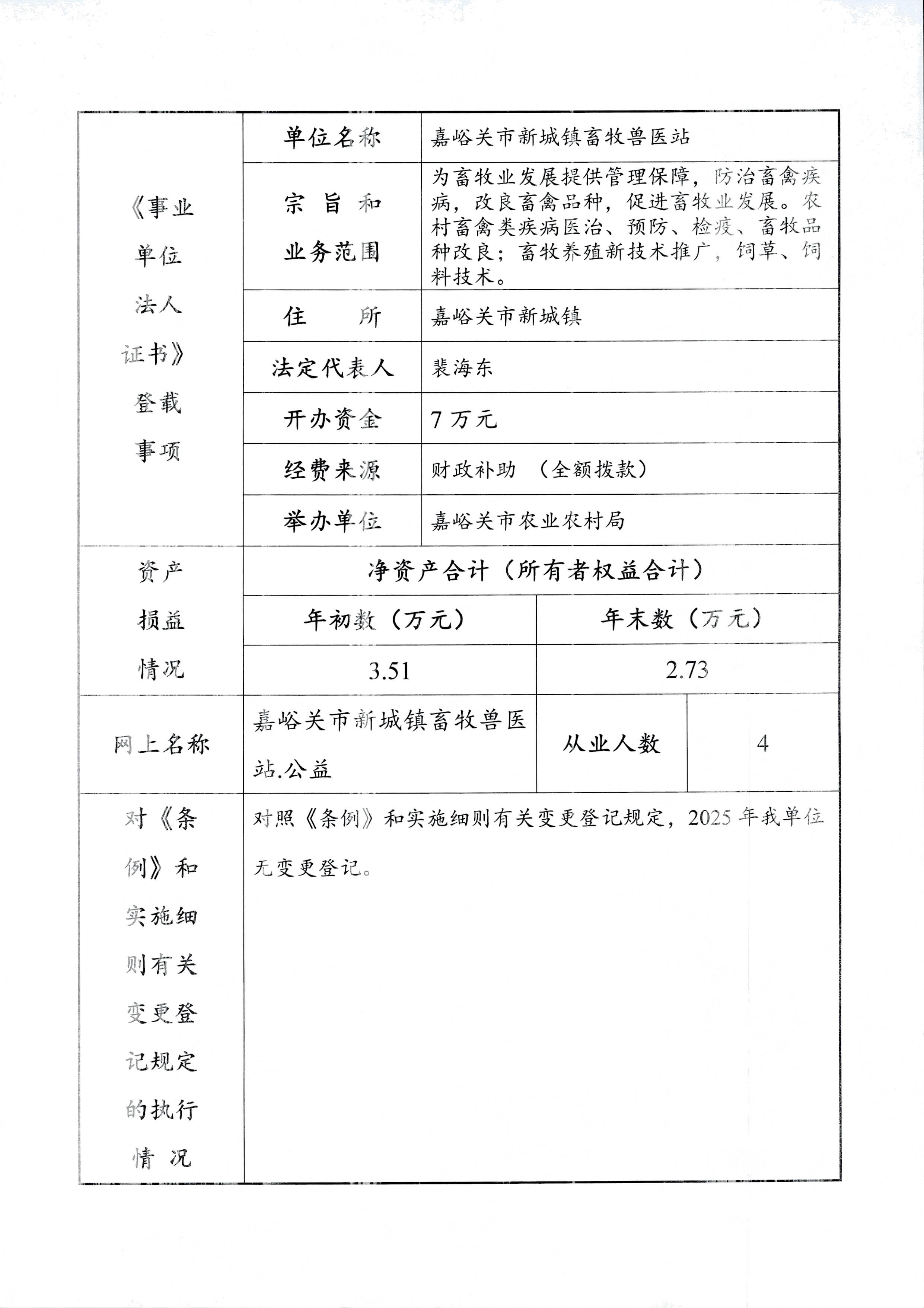 嘉峪关市新城镇畜牧兽医站2025年度事业单位法人年度报告书
