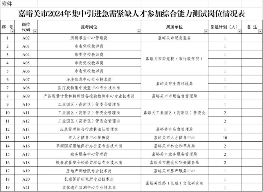 附件:嘉峪关市2024年集中引进急需紧缺人才参加综合能力测试岗位情况表(请识别二维码下载或查看图片)