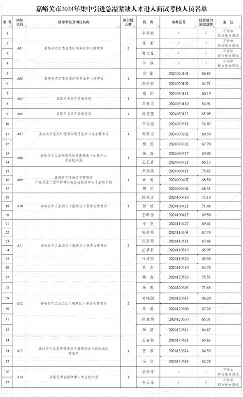 嘉峪关市2024年集中引进急需紧缺人才综合能力测试阅卷工作已结束。根据《嘉峪关市2024年集中引进急需紧缺人才资格初审合格人员参加综合能力测试、面试考核及相关事宜的公告》要求,现将进入面试考核人员名单及相关事宜公告如下: