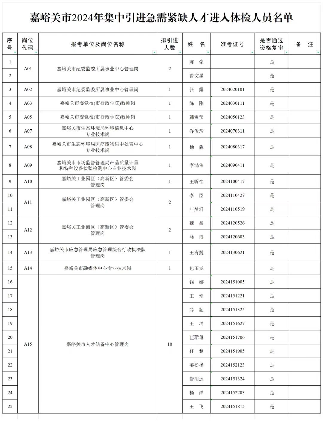 【公示公告】嘉峪关市2024年集中引进急需紧缺人才进入体检人员名单及相关事宜的公告