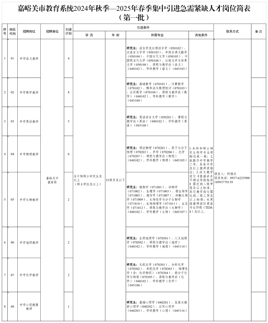 《嘉峪关市教育系统2024年秋季—2025年春季集中引进急需紧缺人才岗位简表(第一批)》。