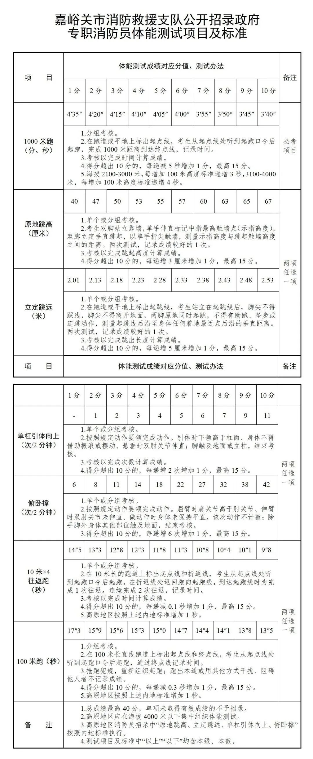 嘉峪关市消防救援支队公开招录政府专职消防员体能测试项目及标准表