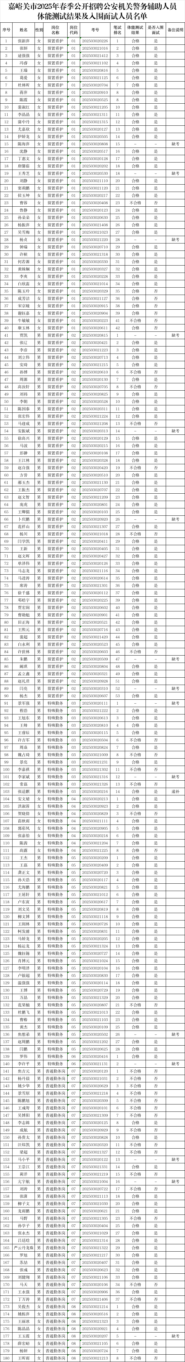 附件:嘉峪关市2025年春季公开招聘公安机关警务辅助人员体能测试结果及入围面试人员名单