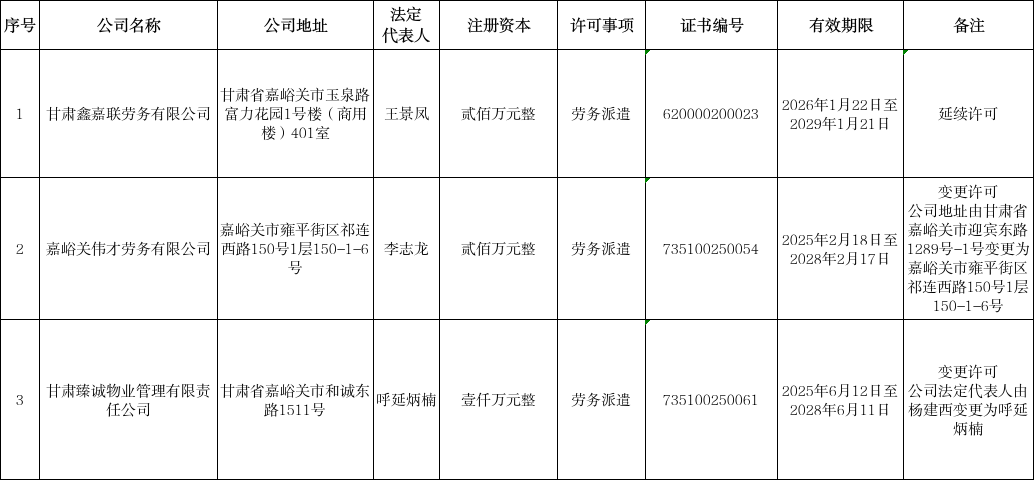 关于准予甘肃鑫嘉联劳务有限公司等3家公司延续和变更《劳务派遣经营许可证》的公示
