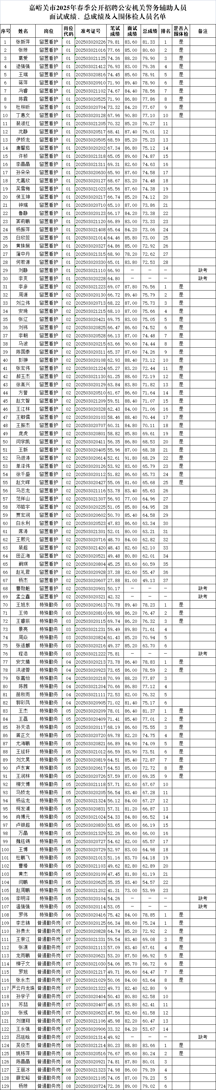 附件:嘉峪关市2025年春季公开招聘公安机关警务辅助人员面试成绩、总成绩及入围体检人员名单