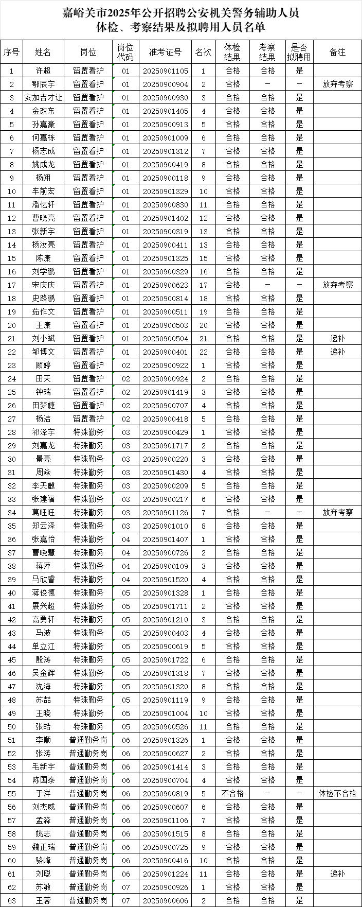 嘉峪关市2025年公开招聘公安机关警务辅助人员体检、考察结果及拟聘用人员公示
