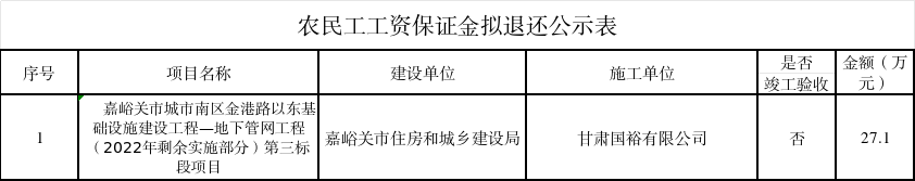 根据《嘉峪关市贯彻落实<甘肃省工程建设领域农民工工资保证金管理办法>实施意见》相关规定,现对以下工程项目(见附件)申请退还农民工工资保证金情况进行公示,如发现存在拖欠农民工工资行为,请及时携带有关证据材料前往嘉峪关市人力资源和社会保障局劳动保障监察科投诉举报。如不存在工资拖欠问题,我局将按规定程序退还农民工工资保证金。