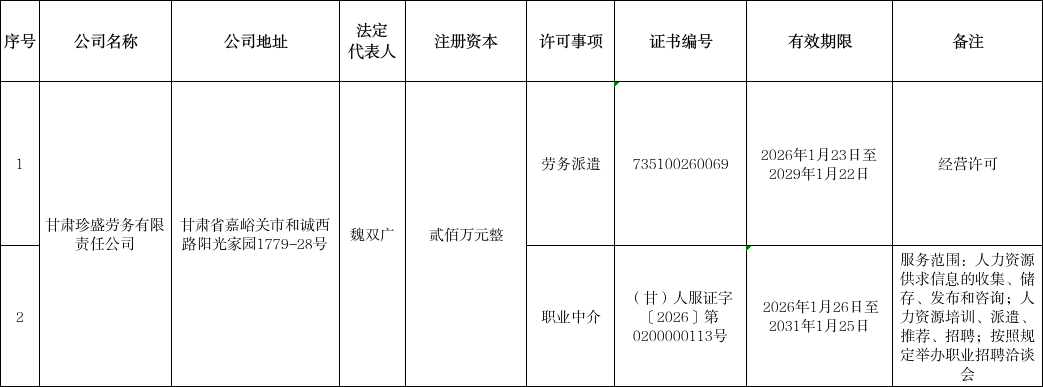 甘肃珍盛劳务有限责任公司向我局提交《劳务派遣经营许可申请书》、《人力资源服务机构申请表》等申报材料,根据《中华人民共和国行政许可法》《中华人民共和国劳动合同法》《劳务派遣行政许可实施办法》《人力资源服务机构管理规定》的规定和要求,按照公平、公正、公开的原则,通过审查评估,甘肃珍盛劳务有限责任公司符合劳务派遣经营和人力资源服务的相关规定和要求,准予经营。现就相关情况予以公示。