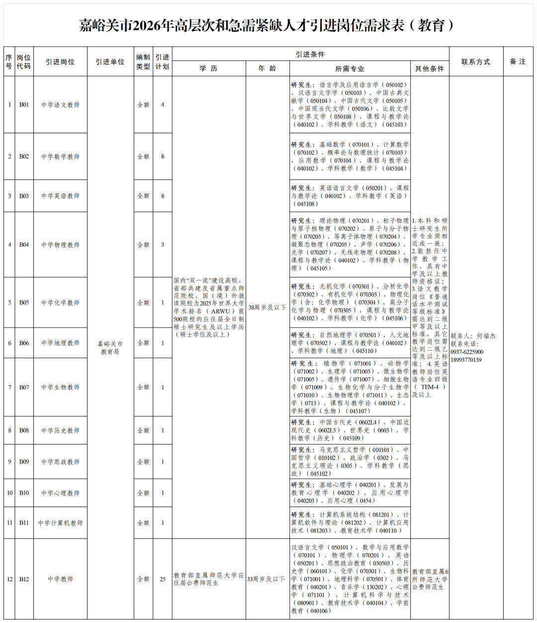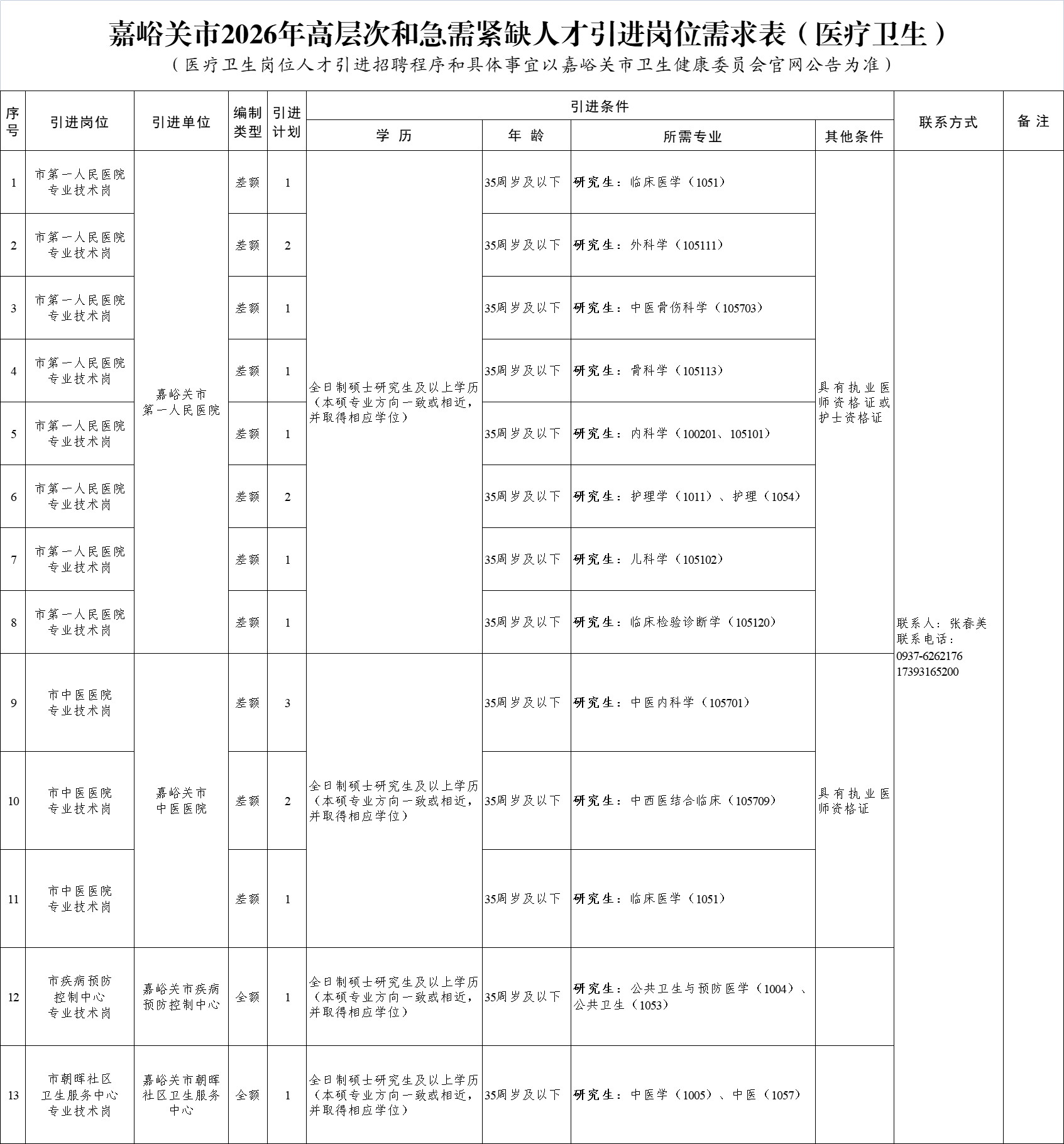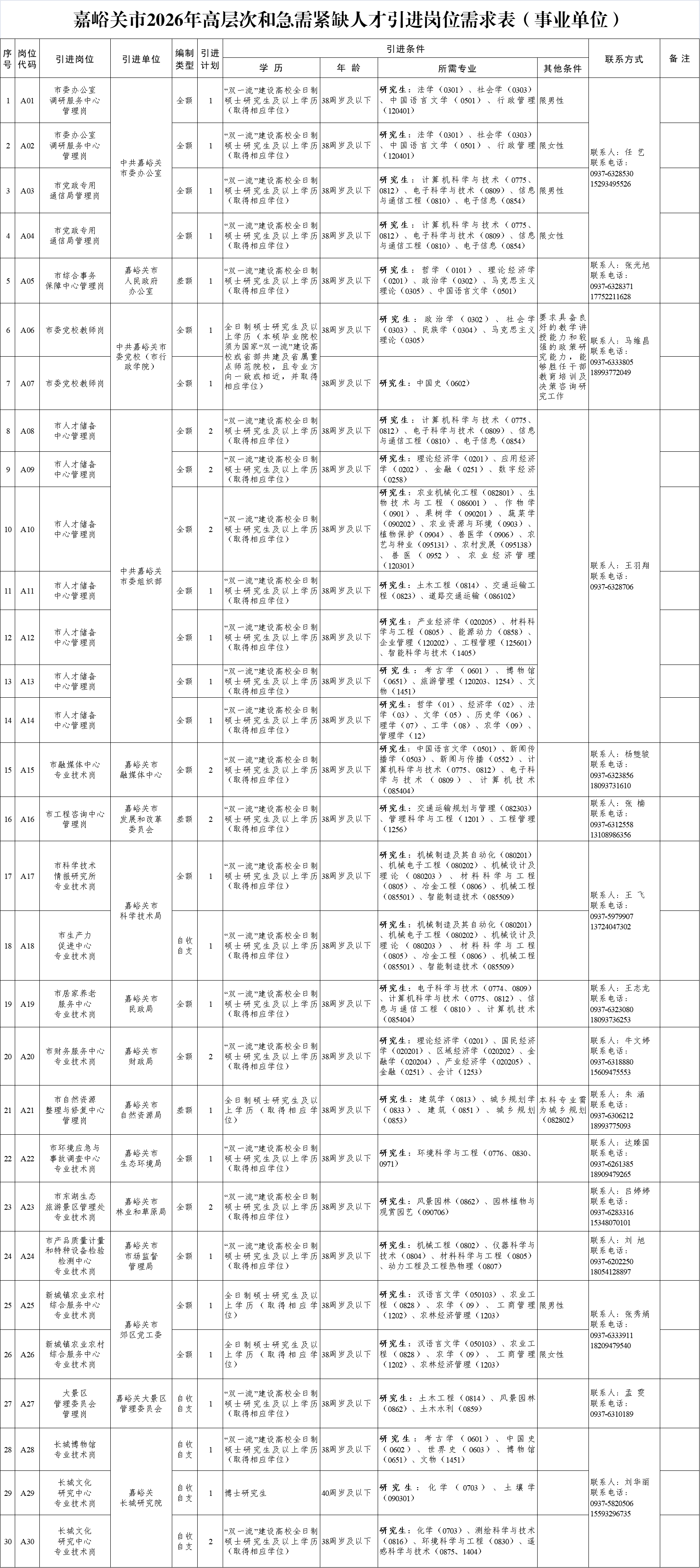 附件:嘉峪关市2026年高层次和急需紧缺人才引进岗位需求表(请查看下图或识别下方二维码)
