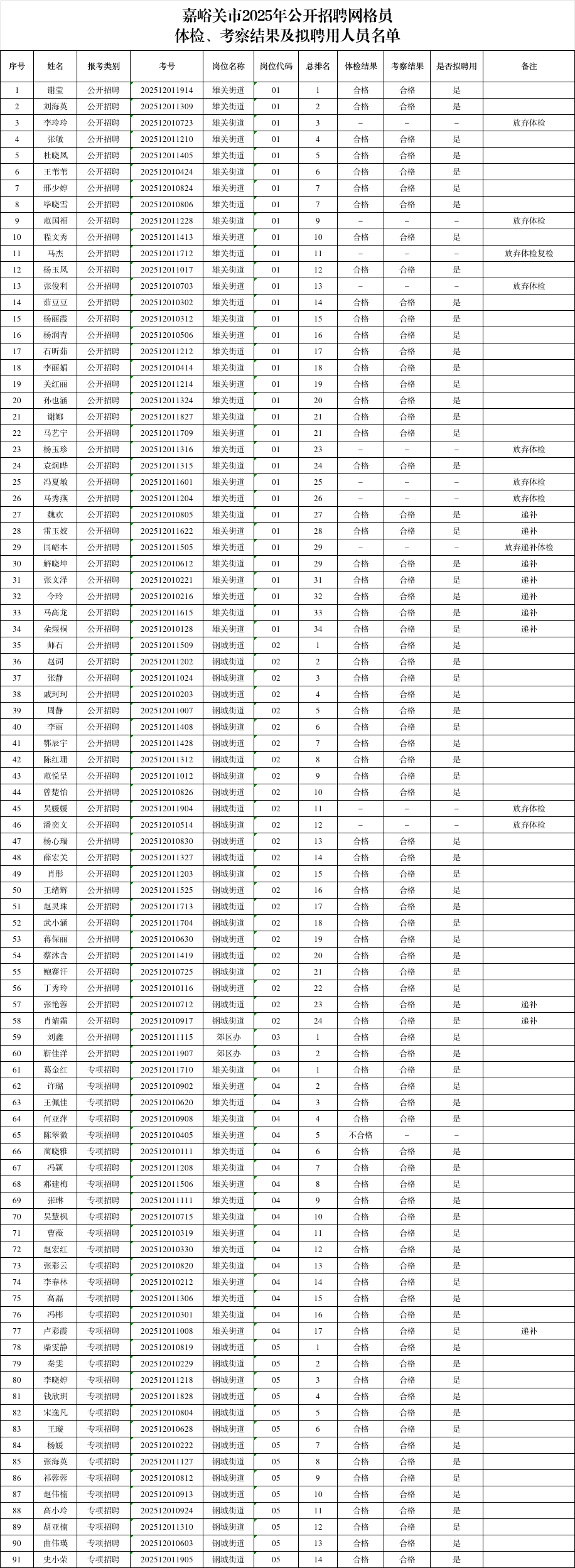 嘉峪关市2025年公开招聘网格员体检、考察结果及拟聘用人员公示