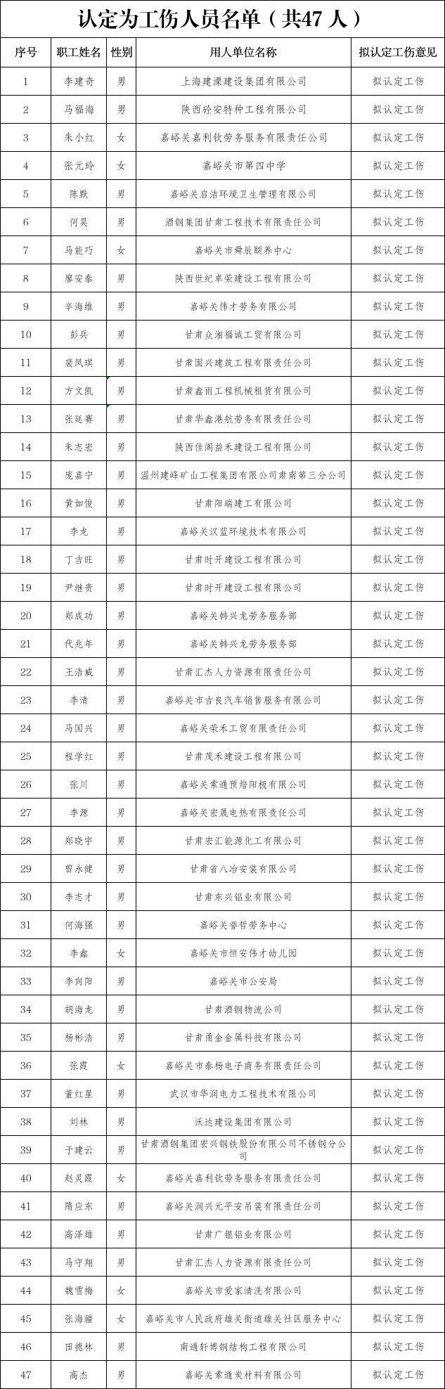 嘉峪关市人力资源和社会保障局关于工伤认定结论的公示