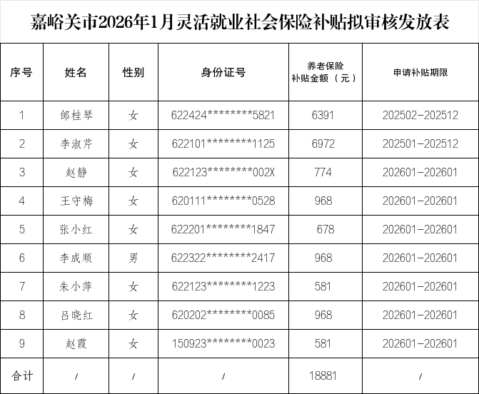 关于嘉峪关市2026年1月灵活就业社会保险补贴审核结果的公示