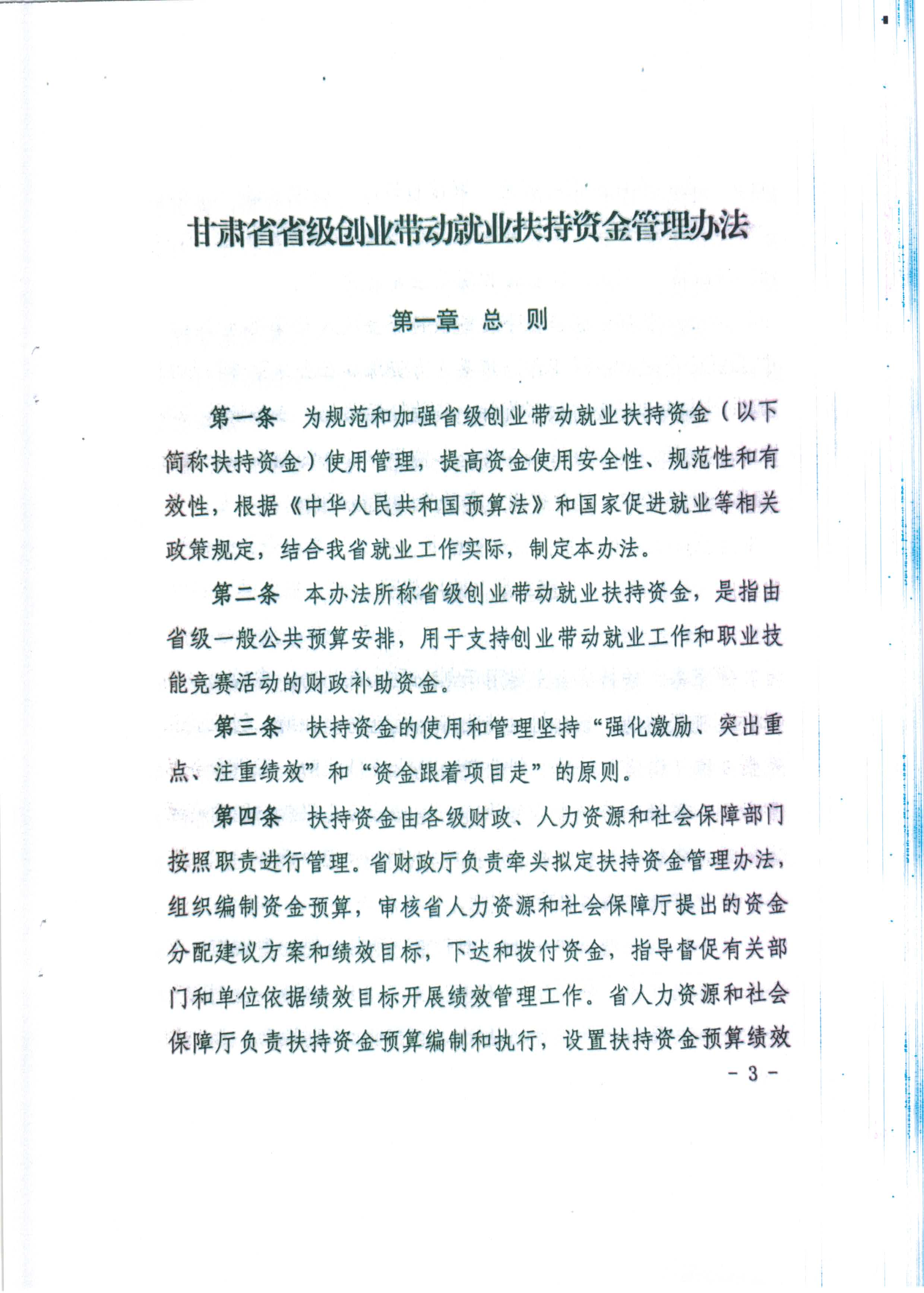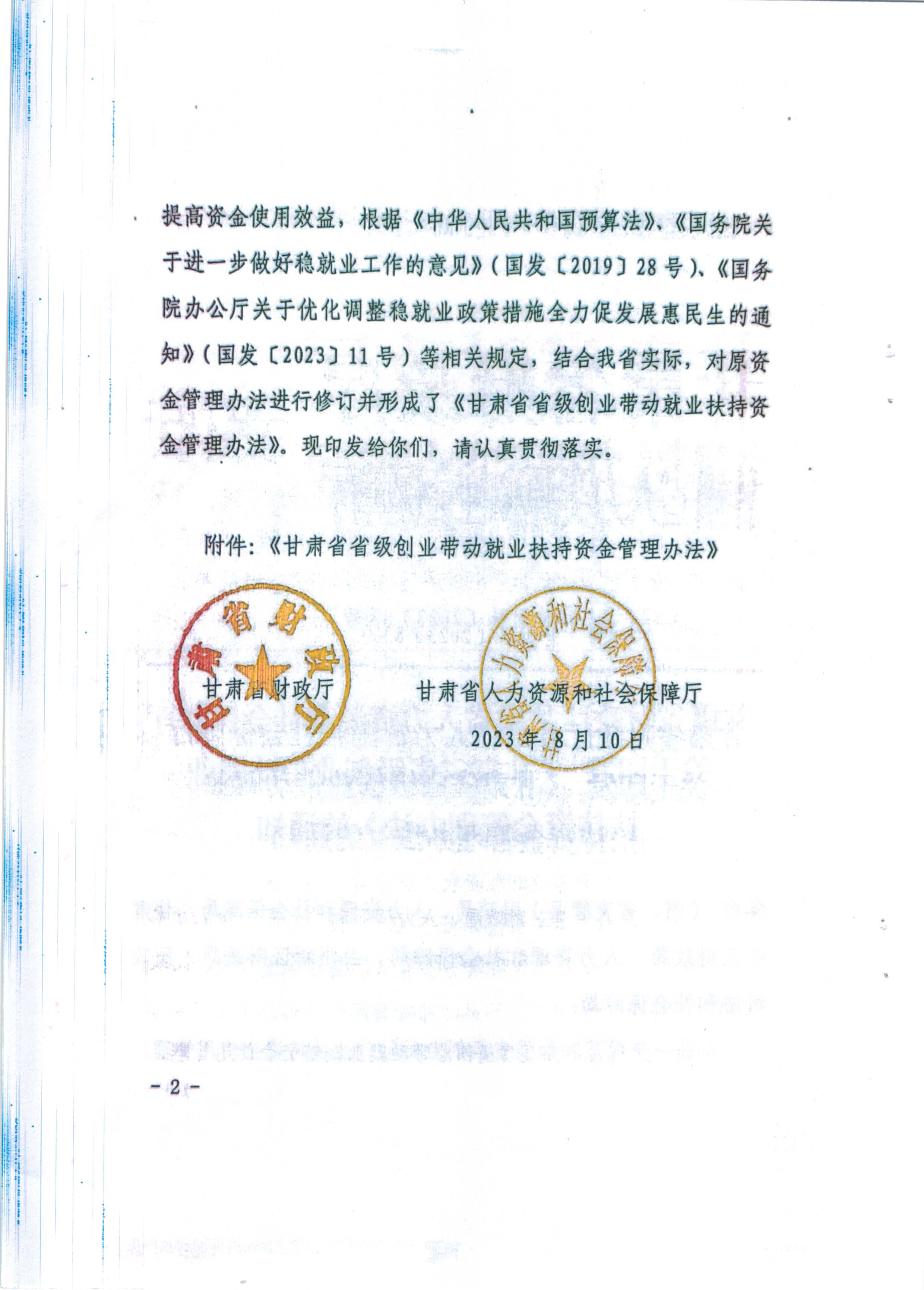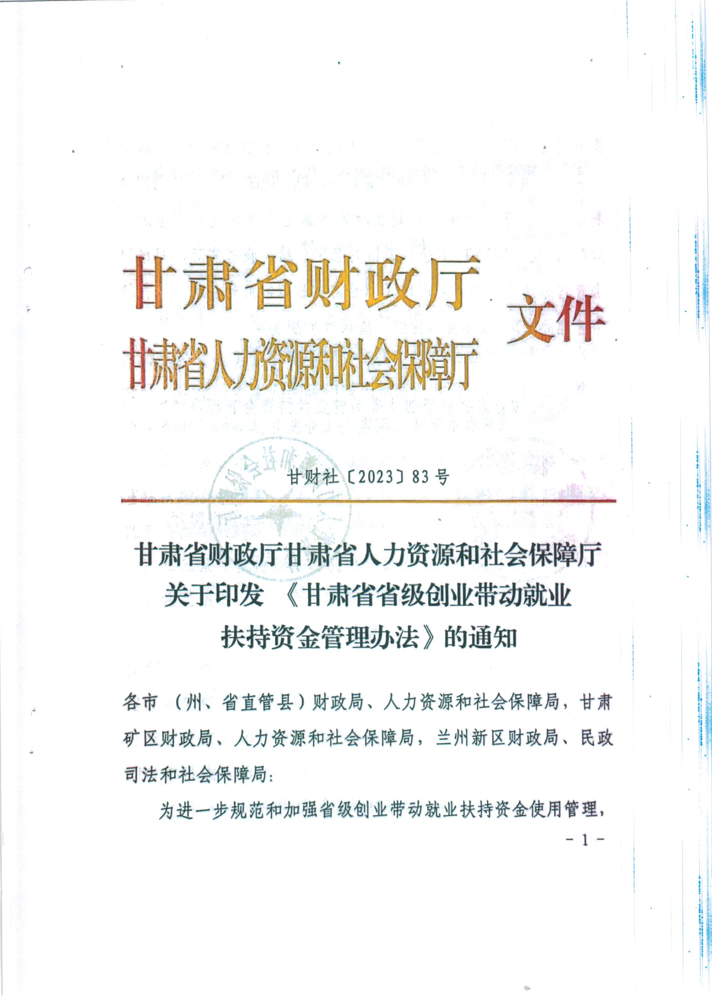 甘肃省省级创业带动就业扶持资金管理办法 -甘财社〔2023〕83号