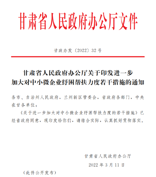 甘肃省人民政府办公厅关于印发进一步 加大对中小微企业纾困帮扶力度若干措施的通知甘政办发 〔2022〕32号.pdf