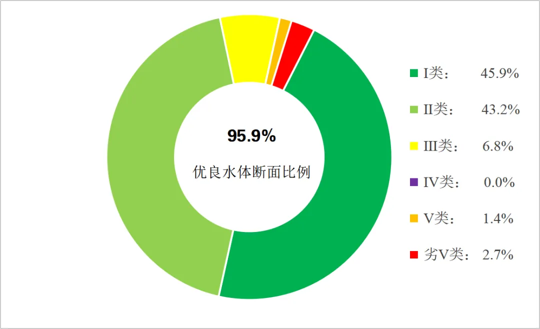 1-2月,全省74个地表水国控断面中,剔除天然背景值后优良水体断面比例为95.9%,劣Ⅴ类水体断面比例为2.7%。