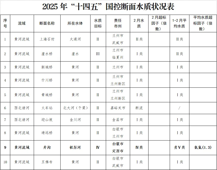甘肃省生态环境厅2025年1-2月全省水环境质量状况