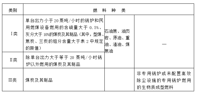 表 1 禁燃区内禁止燃用的燃料组合类别