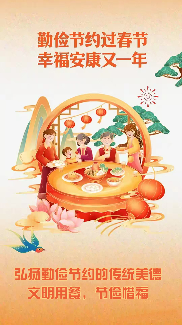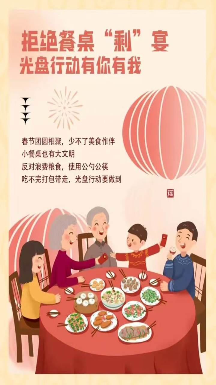 我们在收获“舌尖上的春节”幸福的同时,主动践行“餐餐不剩”的餐桌文明,让“光盘行动”蔚然成风,让勤俭节约的传统美德在新时代绽放出更加璀璨的光芒!